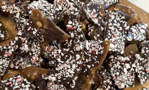 Premium buttery almond toffee topped with a thin layer of mint chocolate and sprinkled with crushed peppermint candies for the perfect holiday treat!